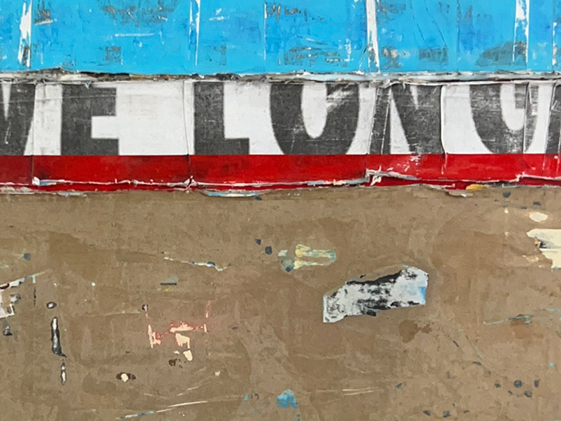 Mixed-media paintings using commercial language and mass imagery as material—fragmented, layered, and suppressed until they function as structure rather than communication.